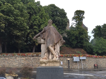 Llegamos a Combourg bajo una fina lluvia que me dicen que aquí cae la mayor parte del año. Paseamos por los vastos jardines bajo los castaños inmensos así que aquí fue donde creció Chauteabriand el magnífico. Yo también decía de niño como Víctor Hugo seré Chautebriand o nada. Y afuera más allá de las torres en una intersección a la vista del lago, la estatua. Qué apuesto Chautebriand.