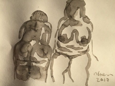 Pinto a dos mujeres gordas una de espaldas y otra de frente dos amigas de mi serie Friends es decir amigas que follan ¿qué amistad sin sexo puede llamarse verdadera amistad? Los hombres somos incapaces de ser amigos a ese nivel en que lo son las mujeres y por eso en España han inventado la figura del colega que es básicamente homosexualidad reprimida. La imagen tiene dos zonas una iluminada y otra menos y me gustan las grandes tetas de la mujer y su cabeza ladeada como mirando el culo de su amiga y más parece ansiosa de meter la lengua allí que saciada ya, creo.